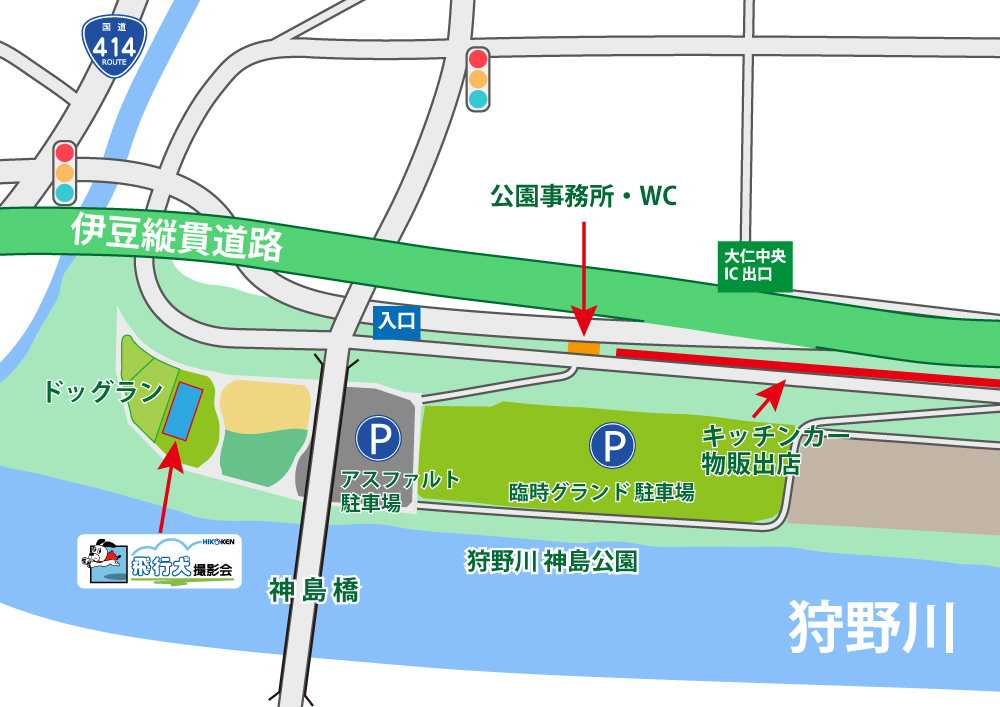 1,2時間の余裕をもって、お越しください。 - 飛行犬撮影会は、ショップ・キッチンカーが並んでいる場所とは違います。このページの各種地図で確認してください。